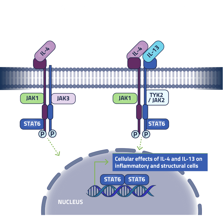 Both IL-4 and IL-13 signals converge on STAT6, a key transcription factor driving Th2 cell differentiation, B cell activation, IgE antibody production, eosinophils activation, and tissue inflammation. Inhibition of STAT6 can block the overactive type 2 inflammation with potential of Dupilumab-like efficacy in multiple Type 2 inflammatory diseases. Our STAT6 lead candidate is a highly potent small molecule that can selectively block STAT6 activation. This candidate combines biologic-like efficacy with the advantage of oral small molecule therapy, and has the potential to bring relief and convenience to millions of patients worldwide.